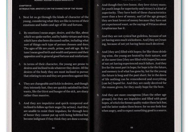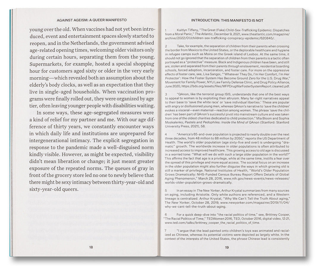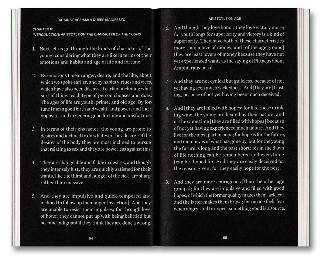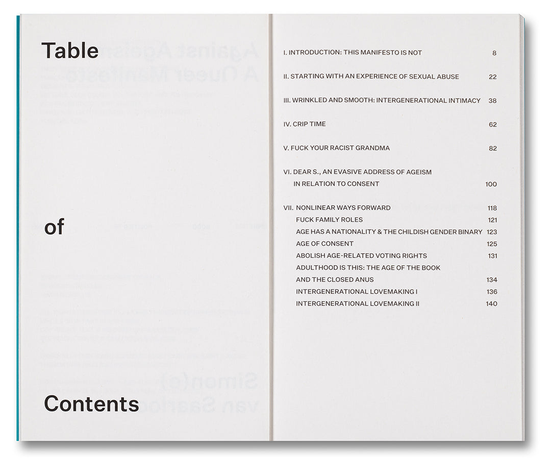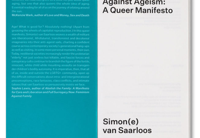 Against Ageism: A Queer Manifesto commence par ce qu’il n’est pas : un argument socio-économique contre l’âgisme, célébrant les « personnes âgées » comme économiquement viables. Simon(e) van Saarloos présente plutôt une critique radicale des arguments conventionnels contre l’âgisme, rejetant les concepts d’« âge » et de « jeunesse » et les hypothèses sur leurs qualités inhérentes.