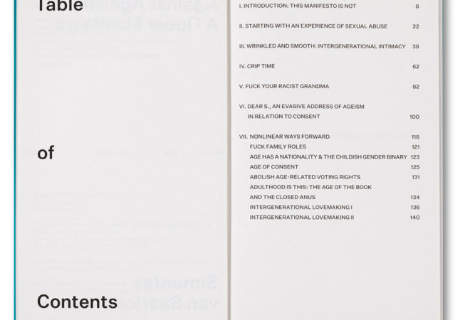 S’inspirant de son expérience personnelle, le manifeste propose une réflexion sur la manière dont l’âgisme se superpose aux structures de la suprématie blanche et du patriarcat. À travers le prisme des théories crip et queer, ainsi que des perspectives anti-carcérales et anti-coloniales sur le temps, ce texte percutant appelle de manière provocante à l’abolition des lois relatives à l’âge, recadrant les conceptions communément admises sur l’âge à partir de la perspective provocante de van Saarloos.