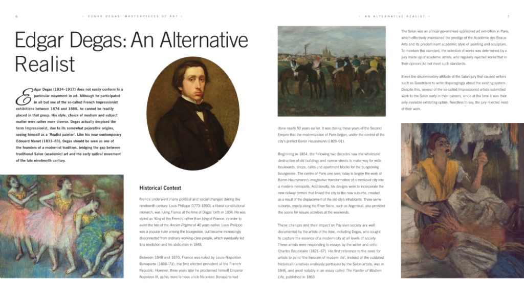 L’artiste français Edgar Degas était célèbre pour ses dessins, ses peintures, ses sculptures et ses gravures. Bien que membre des impressionnistes, avec Monet, Pissaro et Renoir, son travail se concentre sur des sujets d’intérieur, en particulier ses œuvres extrêmement observées sur les ballerines. Ses études magistrales sur la vie réelle résonnent encore aujourd’hui et il reste l’un des peintres les plus populaires du monde. Ce nouveau livre magnifique présente toutes ses œuvres majeures (dont Ballet Rehearsal, The Star et The Ballet Class), avec des légendes détaillées et un long essai sur la vie, l’art et les influences.