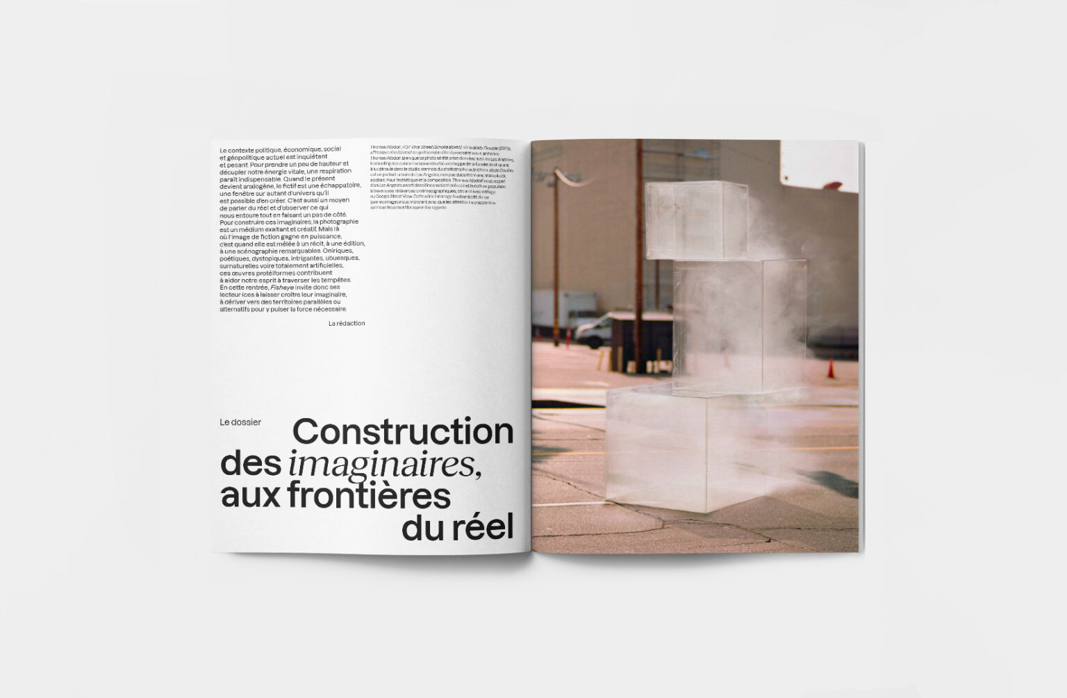 Pour construire ces imaginaires, la photographie est un médium exaltant et créatif. Mais là où l’image de fiction gagne en puissance, c’est quand elle est mêlée à un récit, à une édition, à une scénographie remarquables. Oniriques, poétiques, dystopiques, intrigantes, ubuesques, surnaturelles voire totalement artificielles, ces œuvres protéiformes contribuent à aider notre esprit à traverser les tempêtes. En cette rentrée, Fisheye invite donc ses lecteur·ices à laisser croître leur imaginaire, à dériver vers des territoires parallèles ou alternatifs pour y puiser la force nécessaire : analyse philosophique, édition mariant l’œuvre de Baudelaire à celle d’Antoine d’Agata, interview de Mona Chollet, portrait de Stefano Stoll.