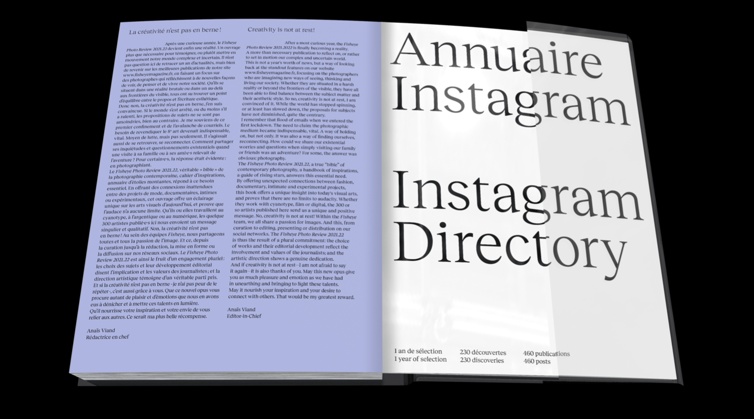 Le Fisheye Photo Review 2021.22, véritable « bible » de la photographie contemporaine, cahier d’inspirations, annuaire d’étoiles montantes offre des connexions inattendues entre des projets de mode, documentaires, intimes ou expérimentaux. Cet ouvrage propose un éclairage unique sur les arts visuels d’aujourd’hui, et prouve que l’audace n’a aucune limite. Qu’ils ou elles travaillent au cyanotype, à l’argentique ou au numérique, les quelque 300 artistes publiées ici nous envoient un message singulier et qualitatif.