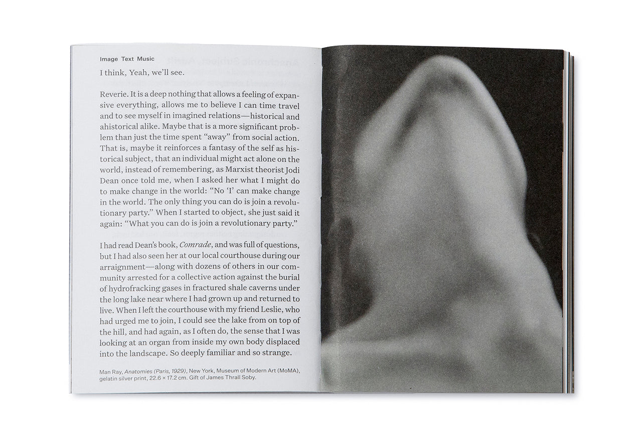 Dans Image Text Music, l’écrivaine et éditrice Catherine Taylor explore le point de rencontre entre le visuel et le verbal. Elle s’inspire de l’essai classique de Roland Barthes de 1977, Image Music Text, qu’elle subvertit en utilisant son titre comme point de départ ludique de sa réflexion sur la nature des œuvres image-texte et sur la musique qui pourrait être faite à leur intersection.
