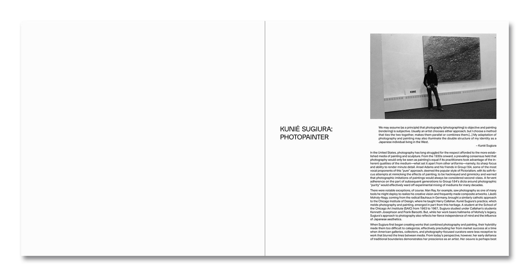 Sugiura n’a cessé de bouleverser les conventions de la photographie en utilisant de nouveaux matériaux pour créer des œuvres à plusieurs niveaux. Ses intérêts pour la corporalité, le monde naturel et les paysages urbains imprègnent ses projets variés et expérimentaux, qui intègrent des images psychédéliques et solarisées, des photographies imprimées sur toile, des photogrammes et des radiographies. Faisant écho à son identité de Japonaise ayant vécu la majeure partie de sa vie à New York, son travail hétérogène constitue une exploration générative des formes hybrides qui remet en question les définitions singulières.