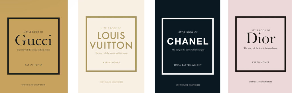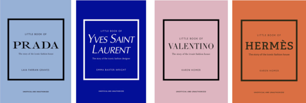 La boîte contient le Petit Livre de Chanel, le Petit Livre de Dior, le Petit Livre de Prada, le Petit Livre de Gucci, le Petit Livre de Louis Vuitton, le Petit Livre d’Hermès, le Petit Livre de Valentino, le Petit Livre d’Yves Saint Laurent.