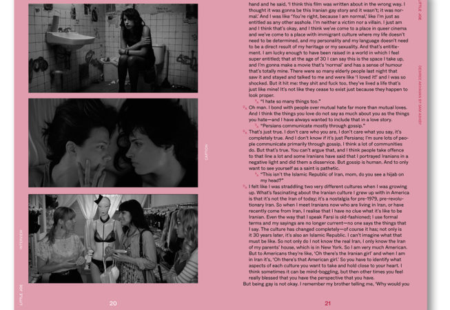 Cette publication difficile à trouver et à tirage limité s’obstine à n’être imprimée qu’une seule fois, privilégiant le bouche-à-oreille et la méthode de la main à la main par laquelle bon nombre des films qu’elle célèbre auraient circulé en premier lieu. Elle rejette l’approche habituelle qui consiste à passer en revue les nouvelles sorties en faveur de l’exploration de films qui demandent à être réévalués, célébrant tout ce qui mérite d’être débattu par la critique, des obscurs films d’art au porno en passant par les classiques hollywoodiens. Chaque numéro propose des essais, des conversations approfondies, des nouvelles, des bandes dessinées, des œuvres d’art commandées et des découvertes d’archives d’un grand nombre d’écrivains, d’artistes, de cinéastes et d’universitaires queers et alliés.