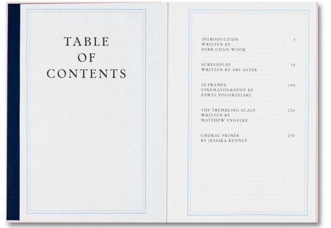 The Midsommar Screenplay Book comprend une introduction de Park Chan-wook, un essai de l’anthropologue Matthew Engelke et un abécédaire illustré de la chorale Hårga par l’artiste vocale Jessika Kenney.