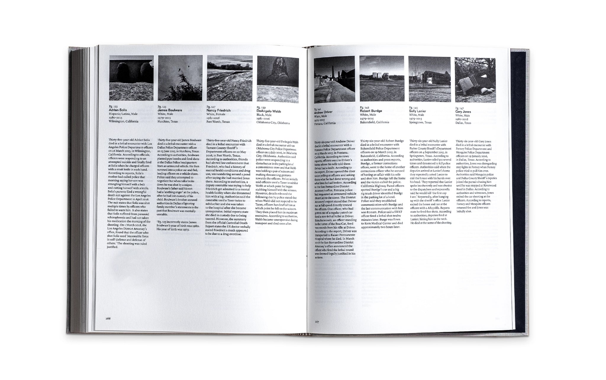 Auparavant, Diana Matar, une Américaine vivant à Londres, a passé des années à documenter les sites de violence soutenue par l’État en Afrique du Nord, en Europe de l’Est et en Europe méridionale. En 2015, elle a tourné son objectif vers son propre pays et a commencé à rechercher qui, comment et où les citoyens mouraient lors d’affrontements avec la police aux États-Unis. Elle a créé des cartes détaillées dans son studio et compilé des informations sur chaque victime décédée en 2015 et 2016.