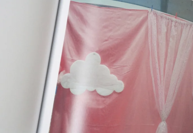Un mur qui saigne, un coin de store qui s’envole ou des buissons marqués par des empreintes identiques sont autant d’éléments simples qui par la frontalité du cadre et la vivacité des couleurs deviennent irréels et fantasmagoriques.