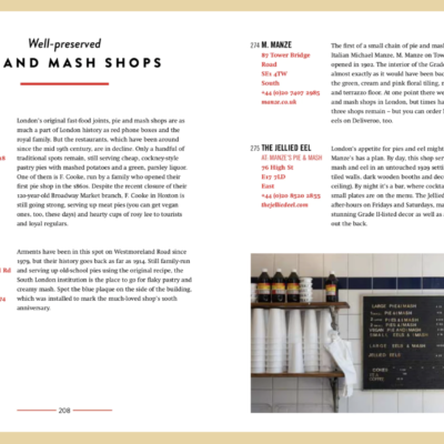 L’auteur Ellie Walker-Arnott vous aidera à voir Londres sous un nouveau jour et à découvrir des sites et des détails que vous n’aviez jamais cherchés auparavant, comme une sandwicherie familiale qui existe depuis les années 1900, une salle de bingo installée dans un ancien cinéma aux arches gothiques, et une boutique traditionnelle de pies & mash qui se transforme en un bar à cocktails animé la nuit.