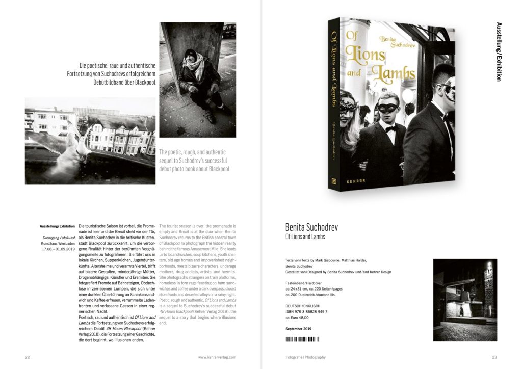 La saison touristique est terminée, la promenade est vide et le Brexit est à la porte lorsque Benita Suchodrev rentre dans la ville côtière britannique de Blackpool pour photographier la réalité cachée derrière le célèbre Amusement Mile. Elle nous conduit aux églises locales, aux soupes populaires, aux maisons de retraite, aux maisons de retraite et aux quartiers pauvres, rencontre des personnages étranges, des mères mineures, des toxicomanes, des artistes et des ermites. Elle photographie des étrangers sur les quais de train, des sans-abri dans des haillons déchirés se régalant de sandwichs au jambon et de café sous un viaduc sombre, des devantures de magasins fermées et des ruelles désertes par une nuit pluvieuse. Poétique, rude et authentique, Of Lions and Lambs est la suite du premier succès de Suchodrev, 48 Hours Blackpool (Kehrer Verlag 2018), la suite d’une histoire qui commence là où finit l’illusion.