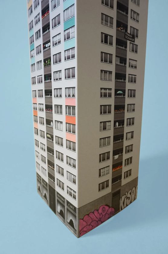 Ce bloc de construction préfabriqué est un hommage aux bâtiments préfabriqués des années 70 et 80. Tout le monde les connaît. Pour certains, ils sont le plus grand péché architectural de l’humanité, pour d’autres, ils sont une icône de l’architecture. Mais une chose est incontestable : il n’y a pas de meilleur modèle pour notre Paperscraper® !