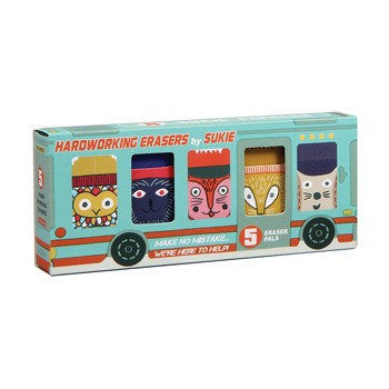die-cut box tray with sleeve, 5 shaped erasers with full-colour illustrated sleeves,