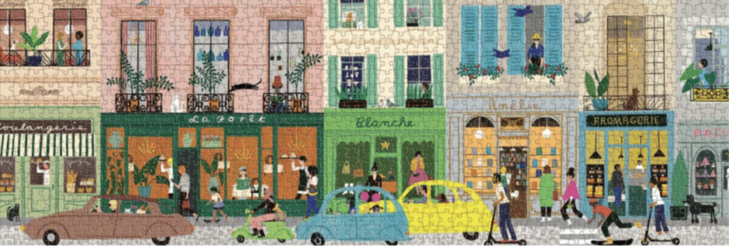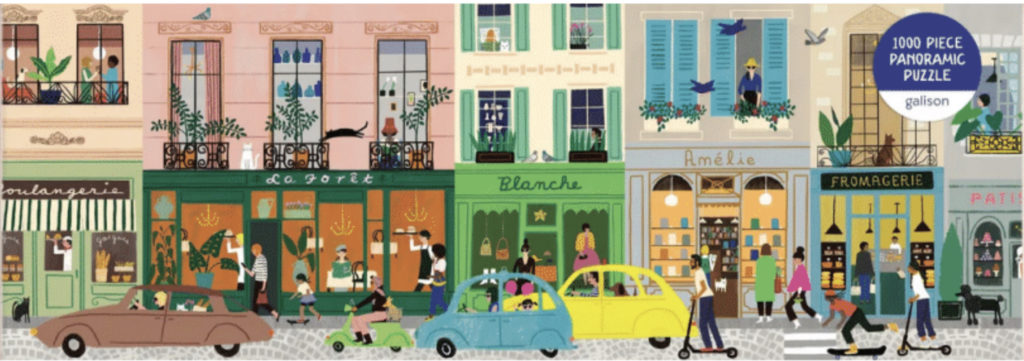Pour le puzzle panoramique 1000 pièces “La vie parisienne”, l’artiste Anne Bentley a créé une représentation authentique et vivante de la vie quotidienne à Paris. Le charme d’antan, les rues pavées étroites, les magasins, les cafés et la vie de rue rappellent des quartiers tels que le Marais. Cette image digne d’être encadrée est présentée sous la forme d’un puzzle panoramique de 1000 pièces de grande dimension.