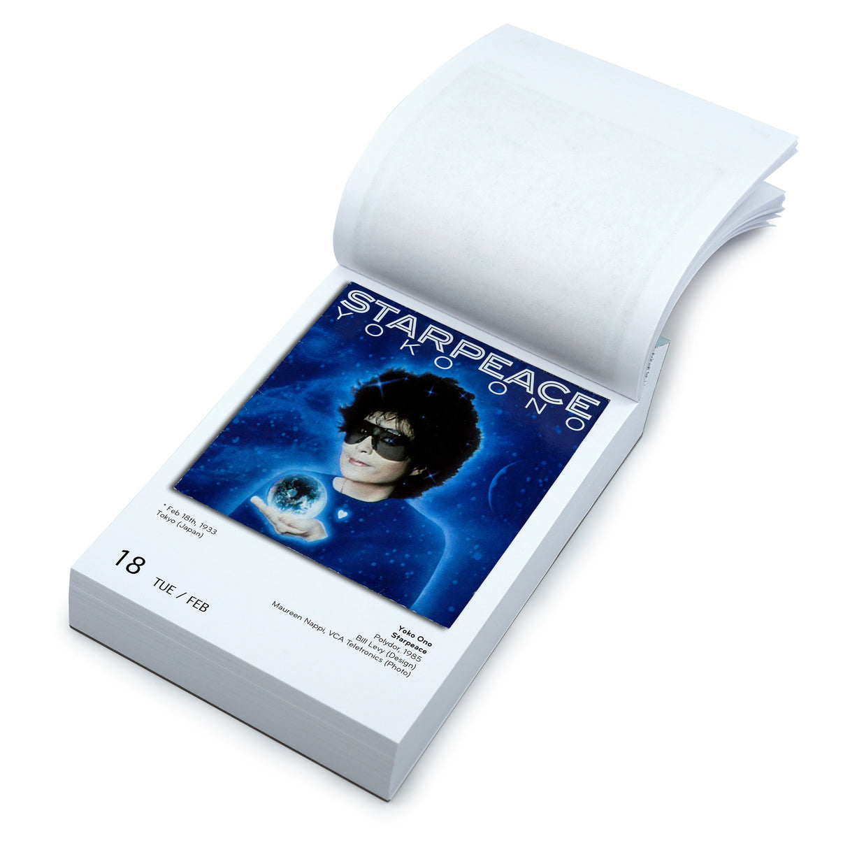 Le premier calendrier détachable au monde comprenant 365 pochettes de vinyles de musiciens connus et inconnus de tous les genres est publié pour la huitième fois. On y trouve de vrais classiques, mais aussi des œuvres inconnues et bizarres. En plus de l’inspiration musicale quotidienne et de la fête graphique pour les yeux, les noms des photographes, illustrateurs et directeurs artistiques des pochettes se trouvent également sur chaque page.