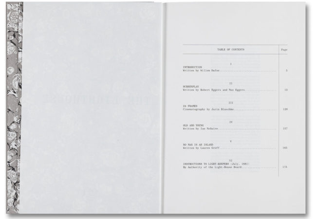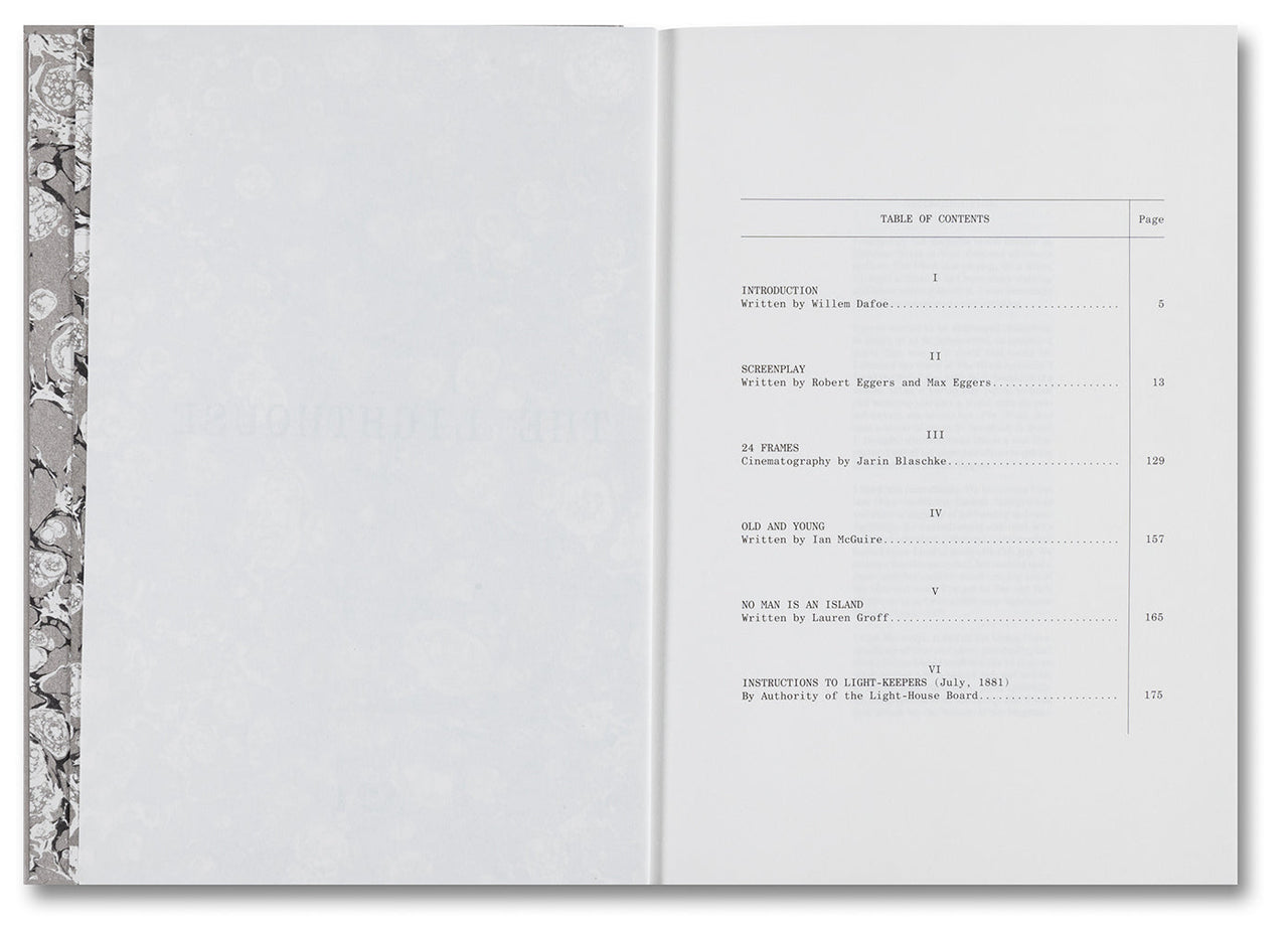 Le livre Screenplay de Robert Eggers pour The Lighthouse comprend une introduction de Willem Dafoe, des essais des romanciers Lauren Groff et Ian McGuire, ainsi que des pages extraites d’un guide du gardien de phare publié en 1881.