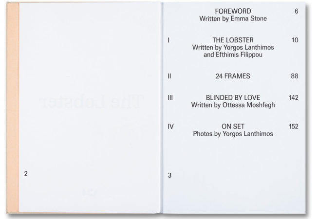 Le scénario de The Lobster est accompagné d’un poème d’Emma Stone, d’un essai d’Ottessa Moshfegh et de photographies de Yorgos Lanthimos prises dans les coulisses.
