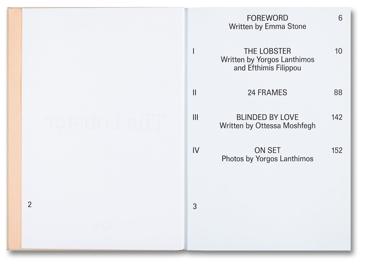 Le scénario de The Lobster est accompagné d’un poème d’Emma Stone, d’un essai d’Ottessa Moshfegh et de photographies de Yorgos Lanthimos prises dans les coulisses.