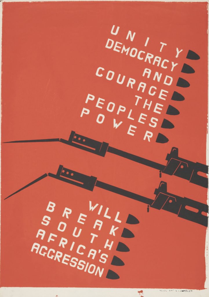 Formé à la fin des années 1970, Medu Art Ensemble a lancé avec force un appel à mettre fin à la ségrégation raciale et à l’injustice violente du système d’apartheid à travers des affiches qui combinaient des images révolutionnaires et des slogans audacieux. Plaidant pour la décolonisation et la domination de la majorité (non blanche) en Afrique du Sud et dans les pays voisins, les membres de Medu ont été persécutés par les Forces de défense sud-africaines et opérés en exil à travers la frontière au Botswana.