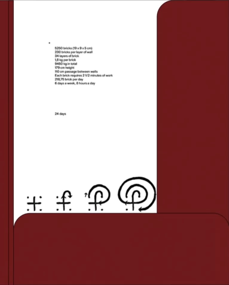 Sans reliure, tel un journal, le lecteur est invité à suivre deux numérotations, une en chiffre arabes, l’autre en chiffre romains. La première lecture offre un déroulé chronologique de l’événement, tandis que la seconde donne l’accès à une nouvelle part de textes et d’images. Cette différentes voies donnent alors l’accès à un labyrinthe aussi bien visuel que mental. En pliant, dépliant et assemblant les feuilles de différentes manières, nous sommes amenés à modifier l’expérience que nous avons du livre et à appréhender de façon singulière celle de la performance.