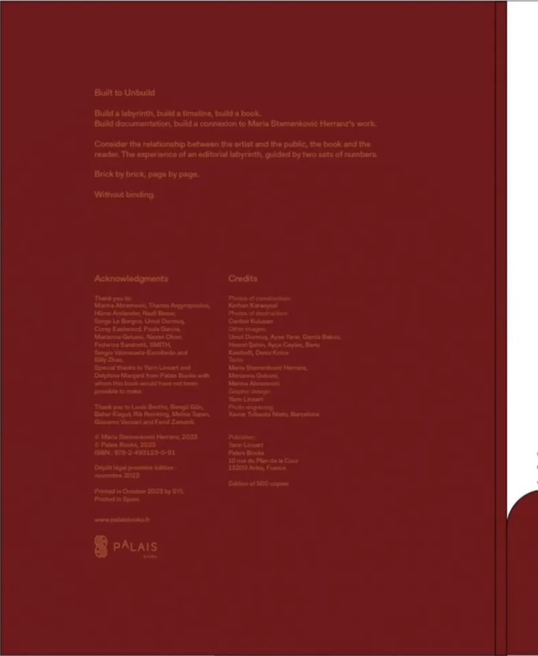 Le livre This Mortal House Building 1 de Maria Stamenković Herranz, édité par Palais Books, cherche à traduire sous une forme éditoriale la performance de l’artiste au Sakıp Sabancı Museum, Istanbul. Durant 24 jours MSH a construit, dans l’espace du musée, un labyrinthe de briques les yeux bandés, puis le dernier jour l’a détruit. À partir des nombreuses photographies qui constituent la documentation de la performance, le livre propose une lecture non linéaire, elle même sujette à des constructions et déconstructions.