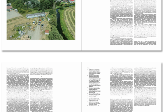 Tout en explorant les possibilités formelles de la photographie aérienne, Topographies témoigne également d’un glorieux dévouement au détail et à la surprise, dans lequel la moindre courbe d’une rivière ou le moindre virage d’une ombre révèle les textures et les couleurs des paysages urbains et suburbains de l’Amérique, le tout étudié avec la rigueur caractéristique de Shore.