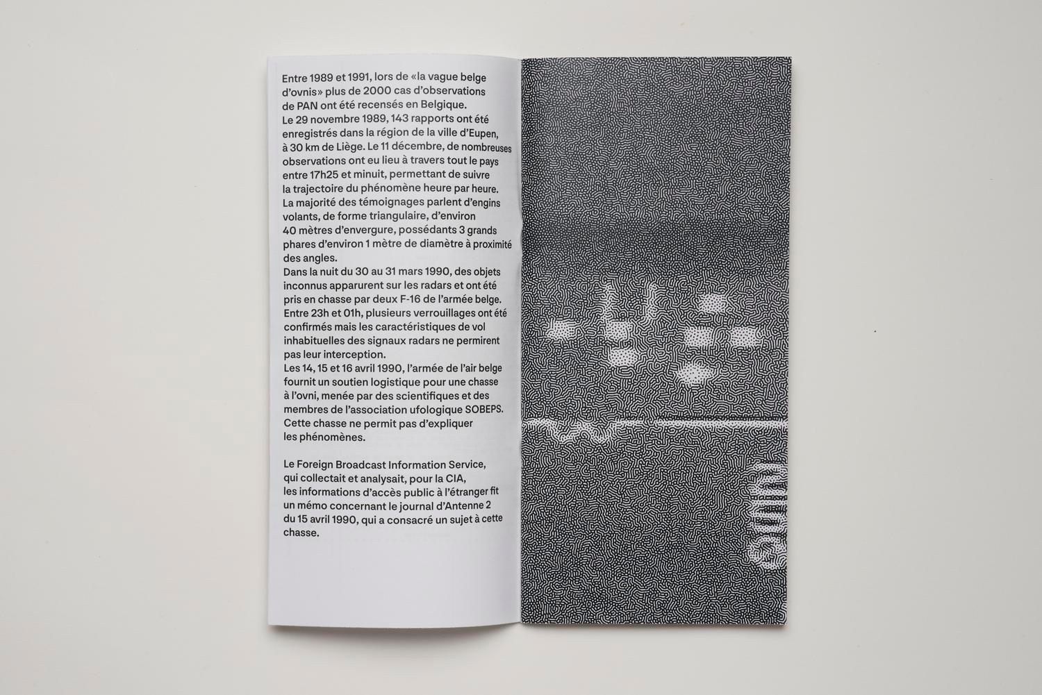 Les F-16 de l’armé et les radars des tours de contrôles ont enregistré des activités toute à fait anormales, sans trouver d’explication. Ce recueil propose une forme graphique et poétique des archives de la CIA qui s’est elle aussi très sérieusement intéressé au phénomène belge.