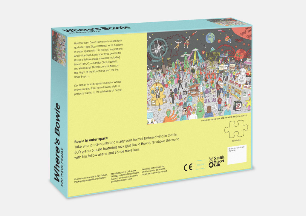 Il y a un jigsaw, qui attend dans cette boîte / Il aimerait que vous le résolviez / mais il pense que ça va vous épater! Un peu comme le génie lyrique de David Bowie, les puzzles sont parfois mystifiants mais toujours satisfaisants. Non seulement le Where is Bowie? Jigsaw Puzzle est un puzzle amusant de 500 pièces axé sur les détails, c’est aussi une aventure interactive de trouver Bowie. Sur le puzzle finit se caché à plusieurs endroits l’image détaillée de Bowie – sous ses diverses formes caméléoniques – attend patiemment d’être repéré par un œil bien entraîné. C’est comme où est Waldo? mais bon, mieux, car il s’agit de Bowie! Ce puzzle regorge de références Bowie qui pourraient même enseigner une chose ou deux aux aficionados de Bowie les plus endurcis.